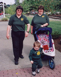 Aunt Dina and I watch as Tristan finishes his first walk on his feet. He walked about 1 km (.6 miles). He complained about it at first, but then got into it. This volksmarch (on 9/2) was in Snoqualmie and went out to the falls. The falls are taller than Niagra. |